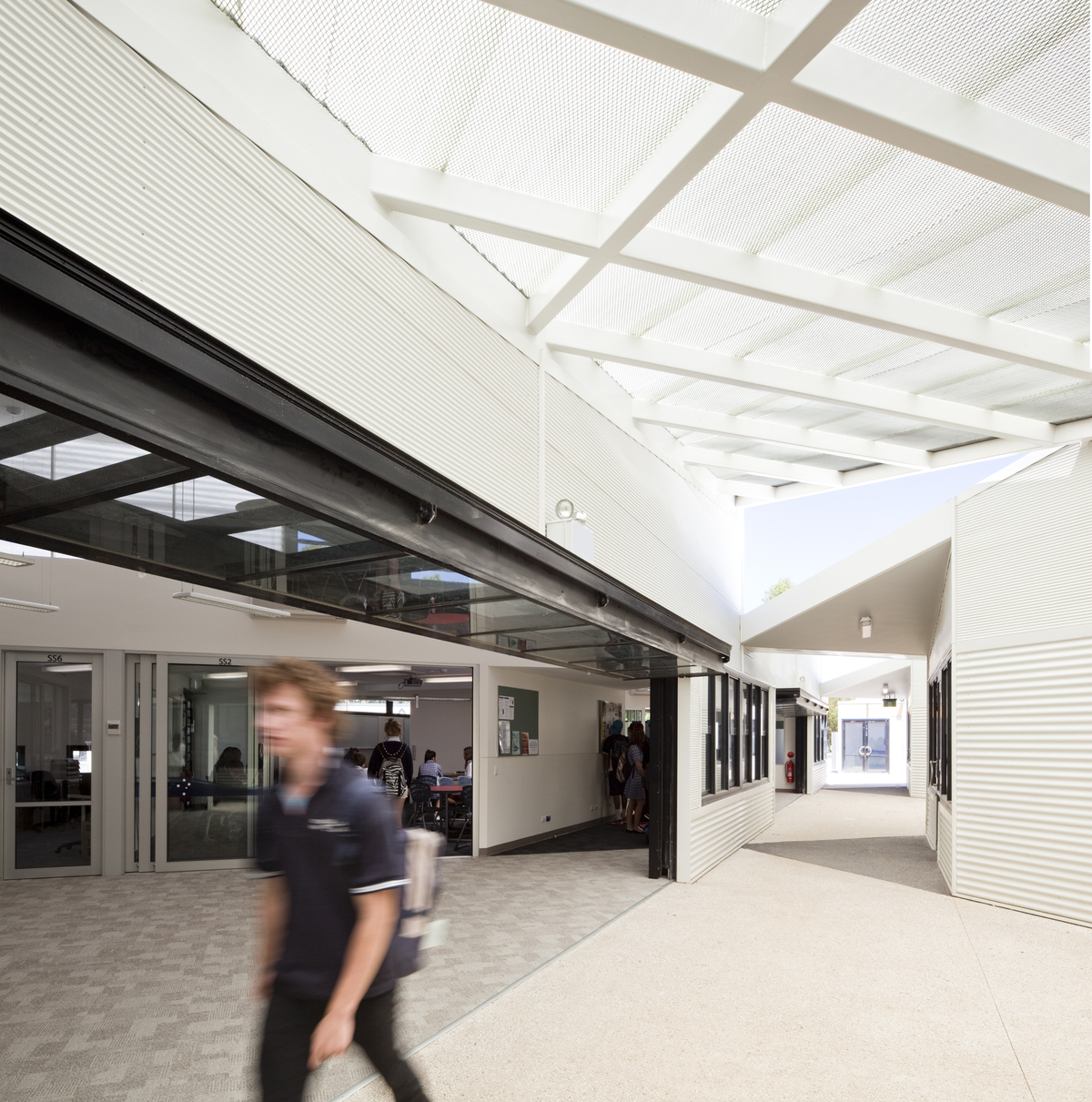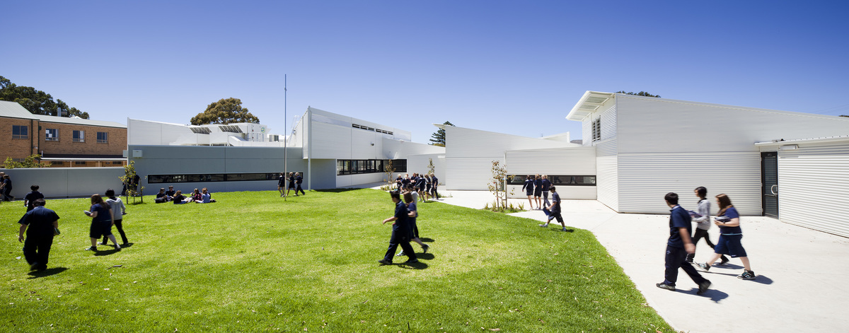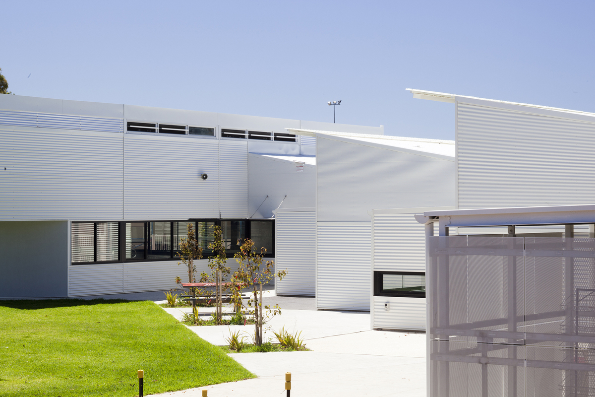 Cascading roof planes reference the Victor Harbor coastline and speak a language of hierarchy between the various spaces in the new facilities. The roof forms culminate in a large butterfly roof over the Resources Building that addresses the piazza as the centre piece to the senior school.