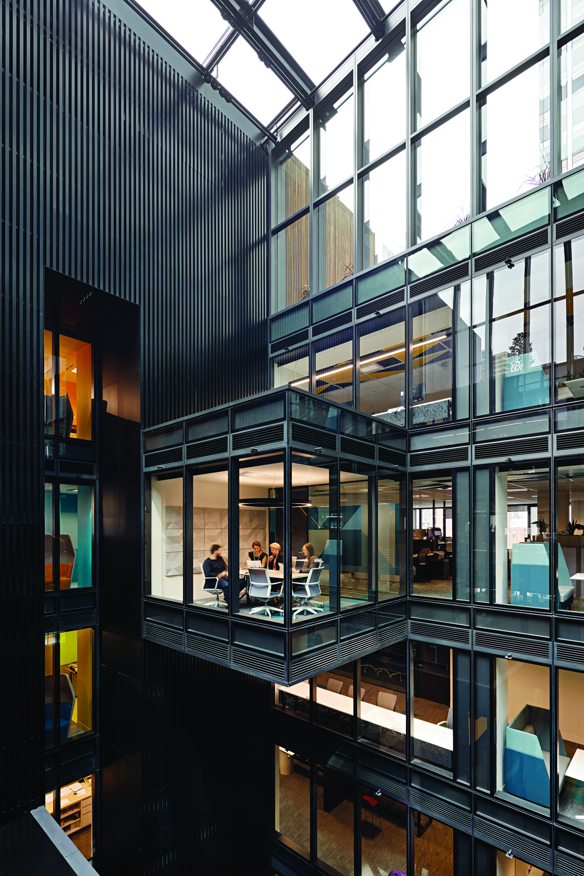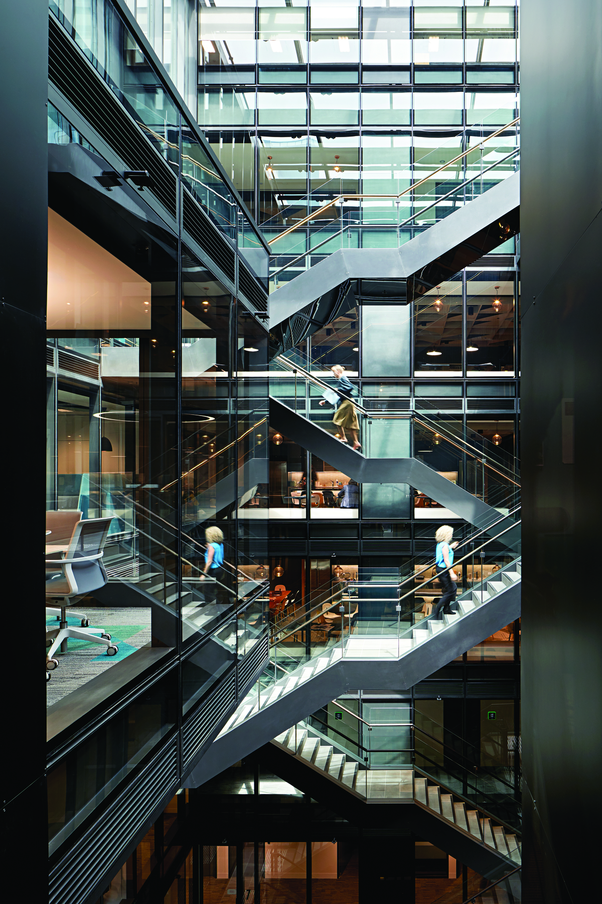 The sunlit focal point of the office is a central 10-storey glass atrium with a stairway between floors.