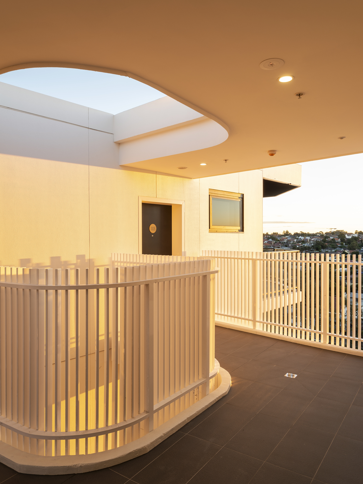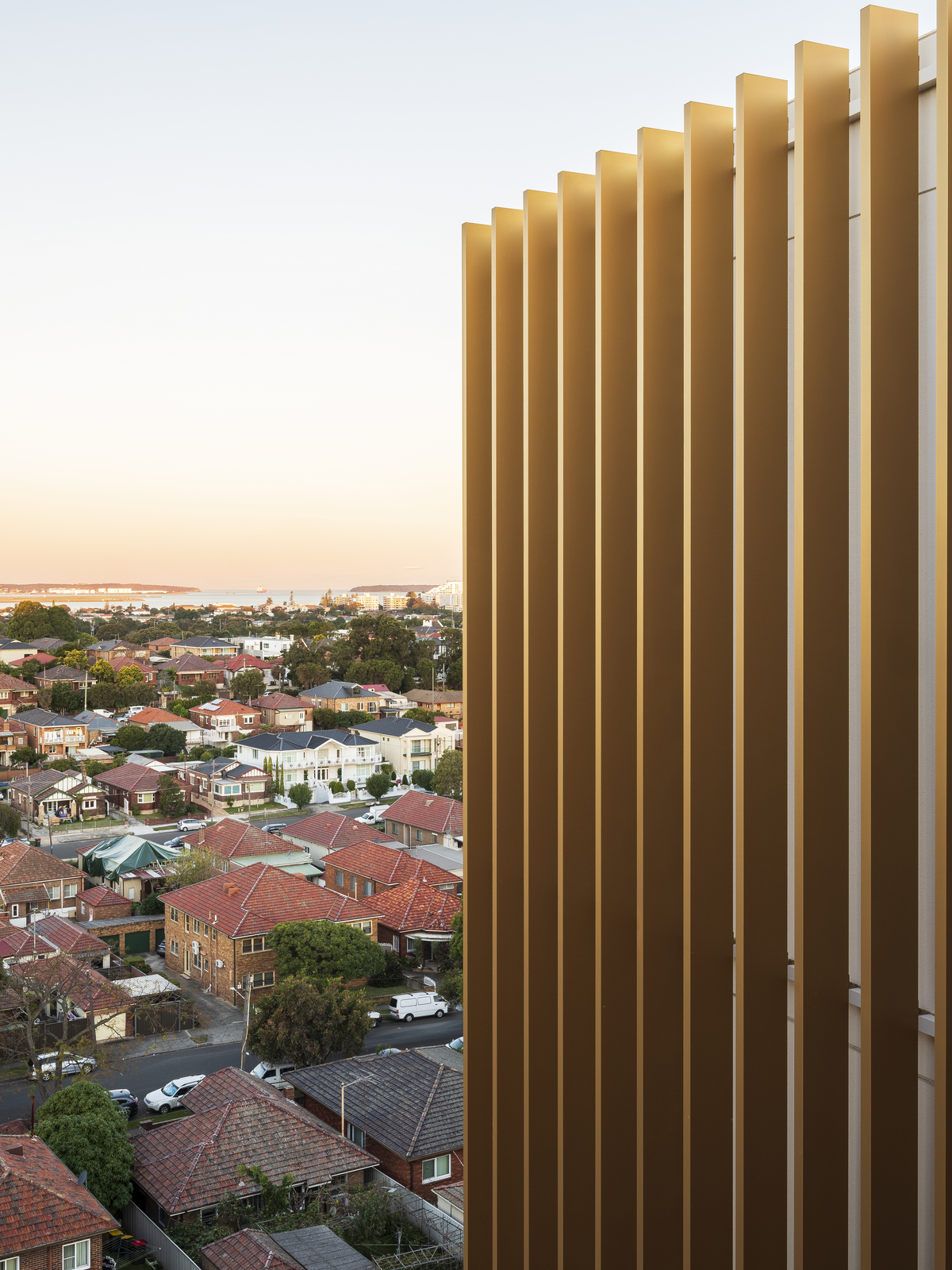 The breezeway is veiled with a metallic golden screen derived from the organic lines of neighbouring Botany Bay.