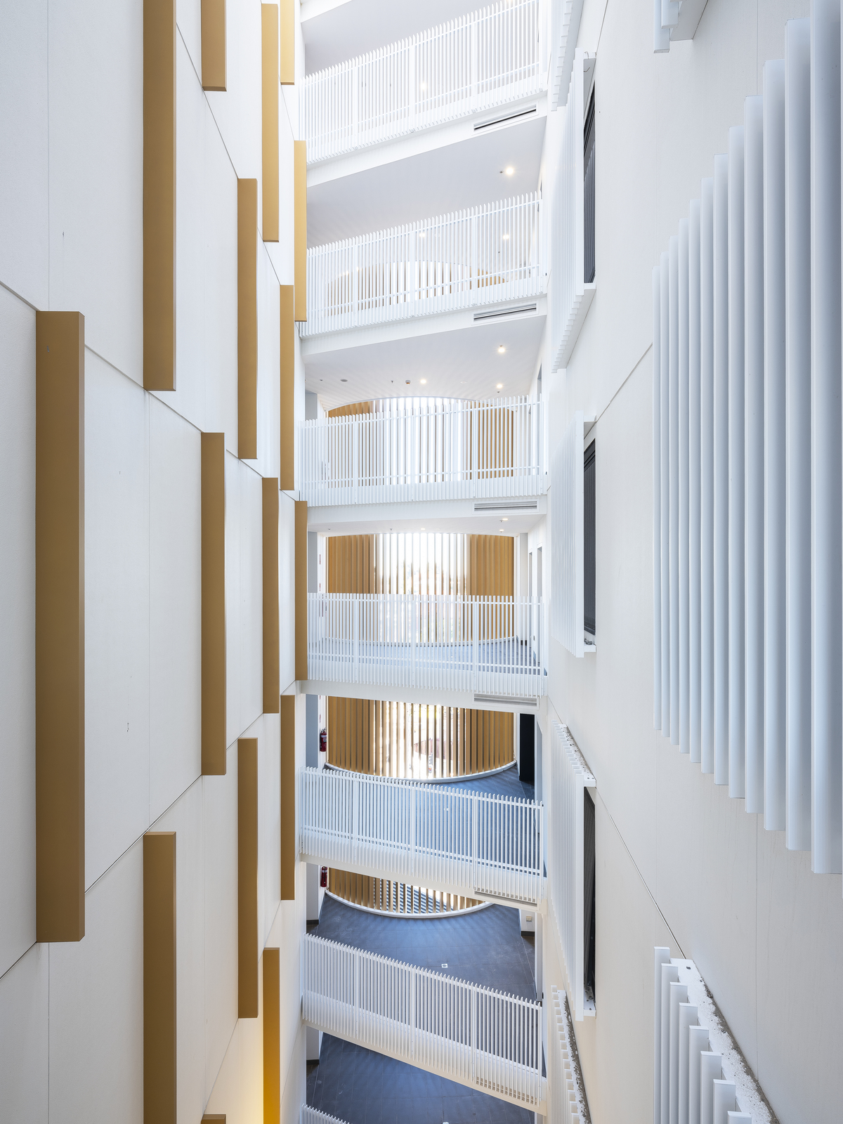 Bridges and voids weave through the space and connect vertically dispersed communal courtyards.