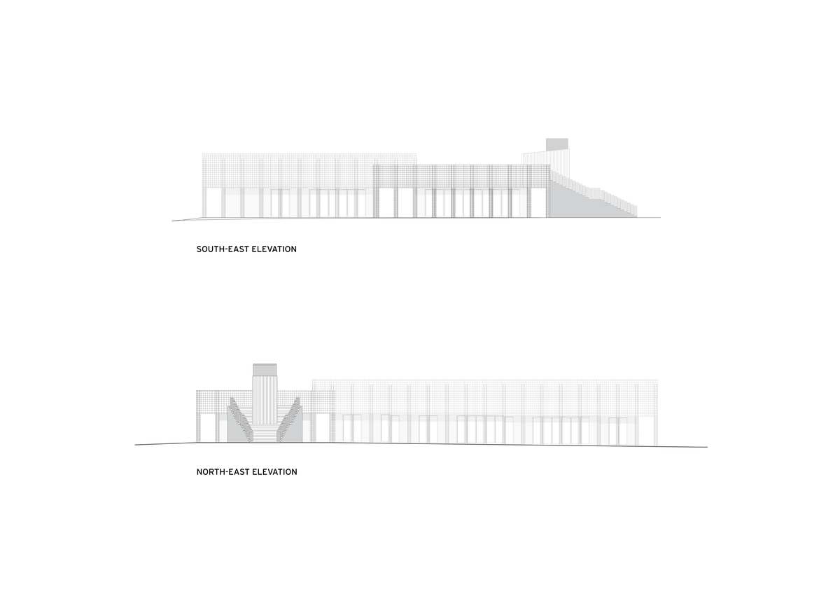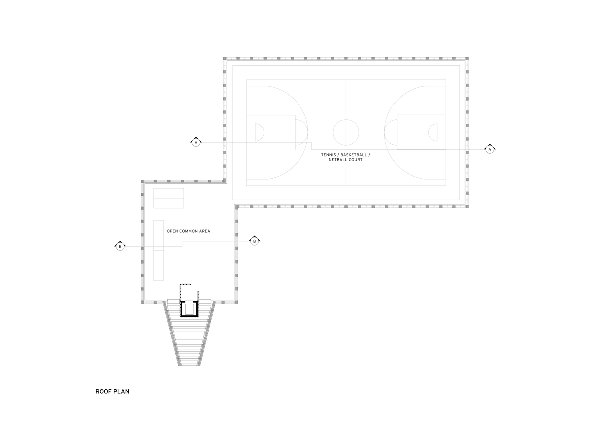 One of the tennis courts it replaces has been ‘lifted’, creating usable space between two massive exposed concrete slabs — the roof and floor of the building.