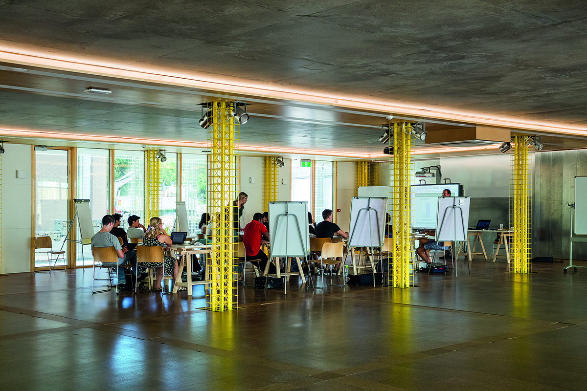 Full height glazing surrounds the teaching spaces, making the building transparent.