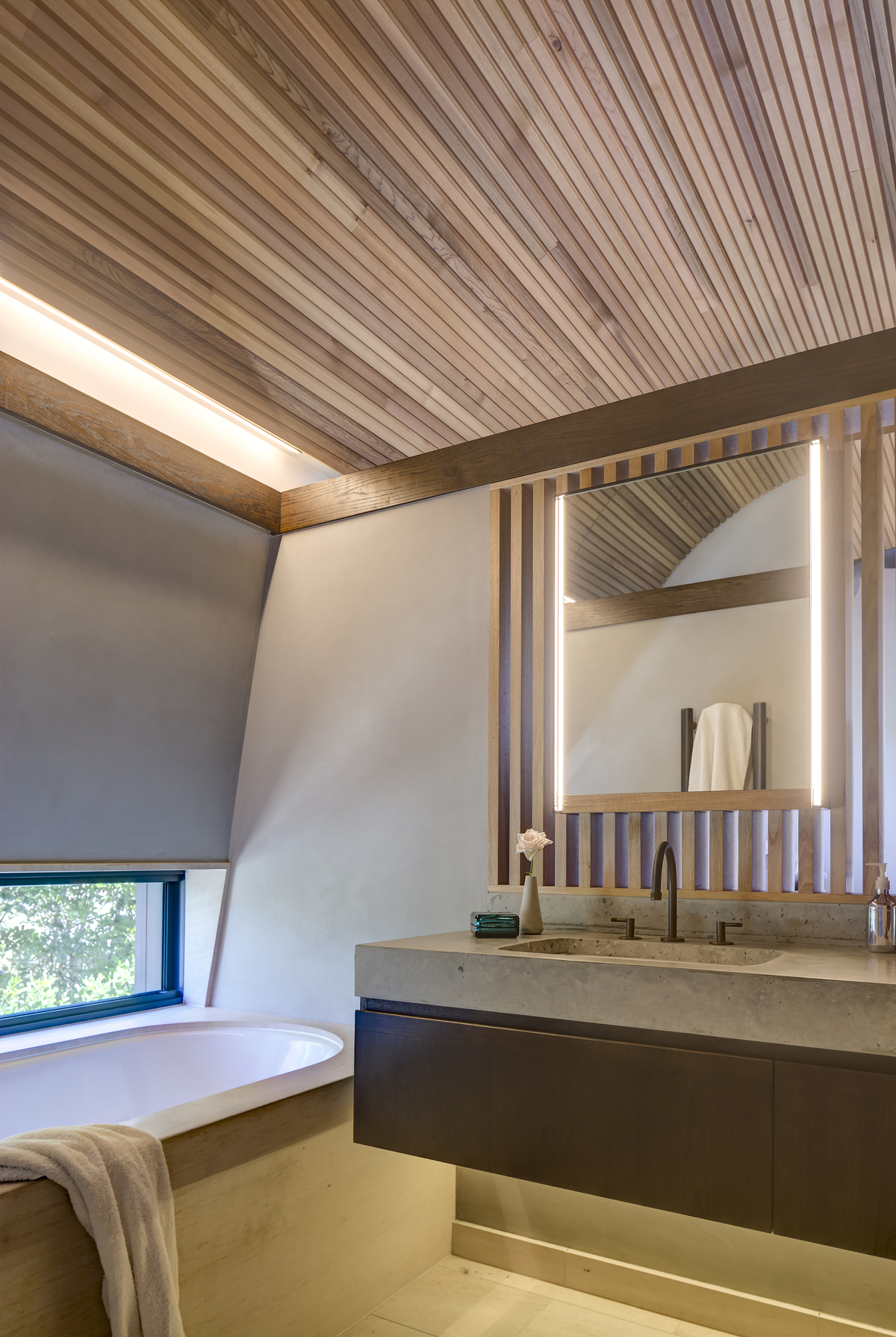 Soaring above the living area that faces the ocean, it helps amplify the magnificent views whilst becoming lower towards the sleeping quarters of the home, creating a heightened sense of intimacy and privacy.