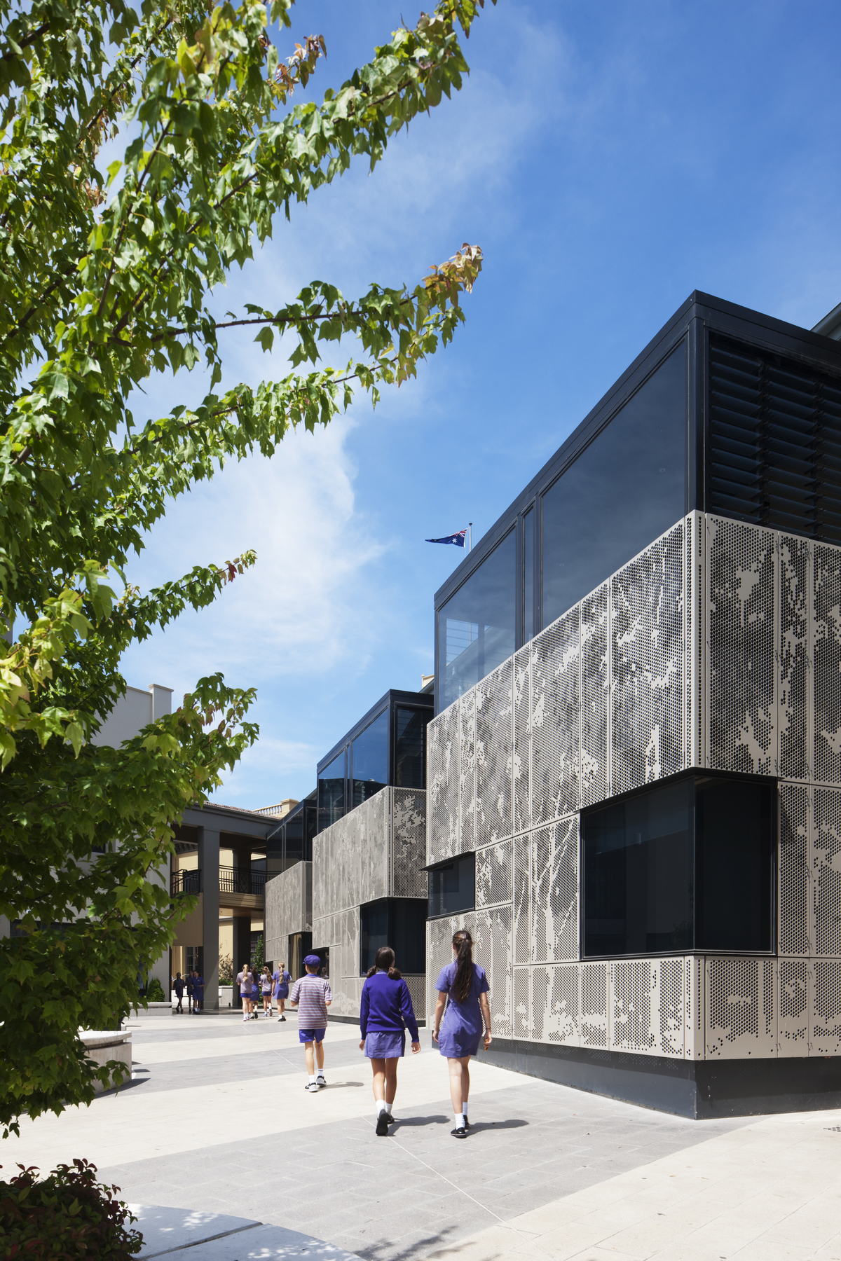 The size and type of internal spaces generate a rhythm across the exterior, working to complement the striking representation of the school’s crest that has been ‘carved into the facade of the building.