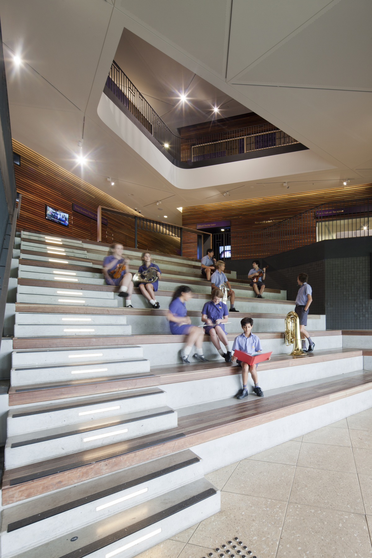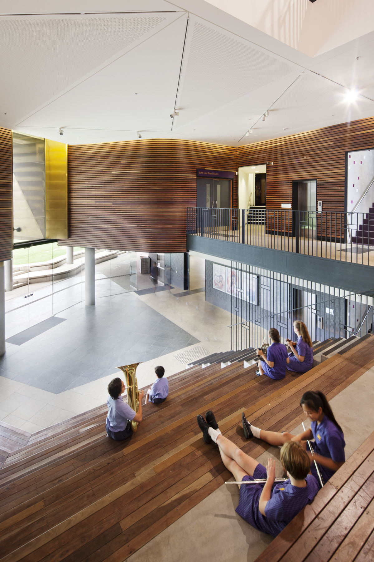 The building incorporates a purpose-built auditorium and stage with associated backstage, side stage, and fly tower as well as a dance studio and drama theatrette, new staff administration areas, recital spaces, a band room, and additional flexible spaces suitable for teaching and rehearsal.