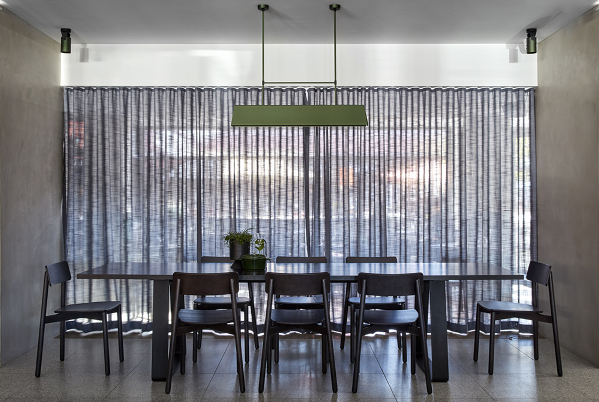 Warm finishes of grey stained oak timber joinery, terrazzo, and timber floors, and soft polished concrete walls are offset by the punch of the green tiles and marble.