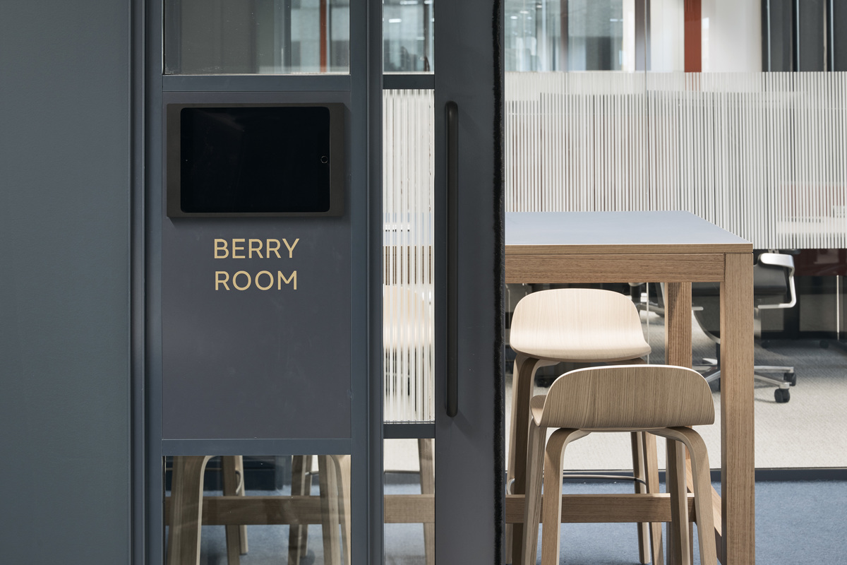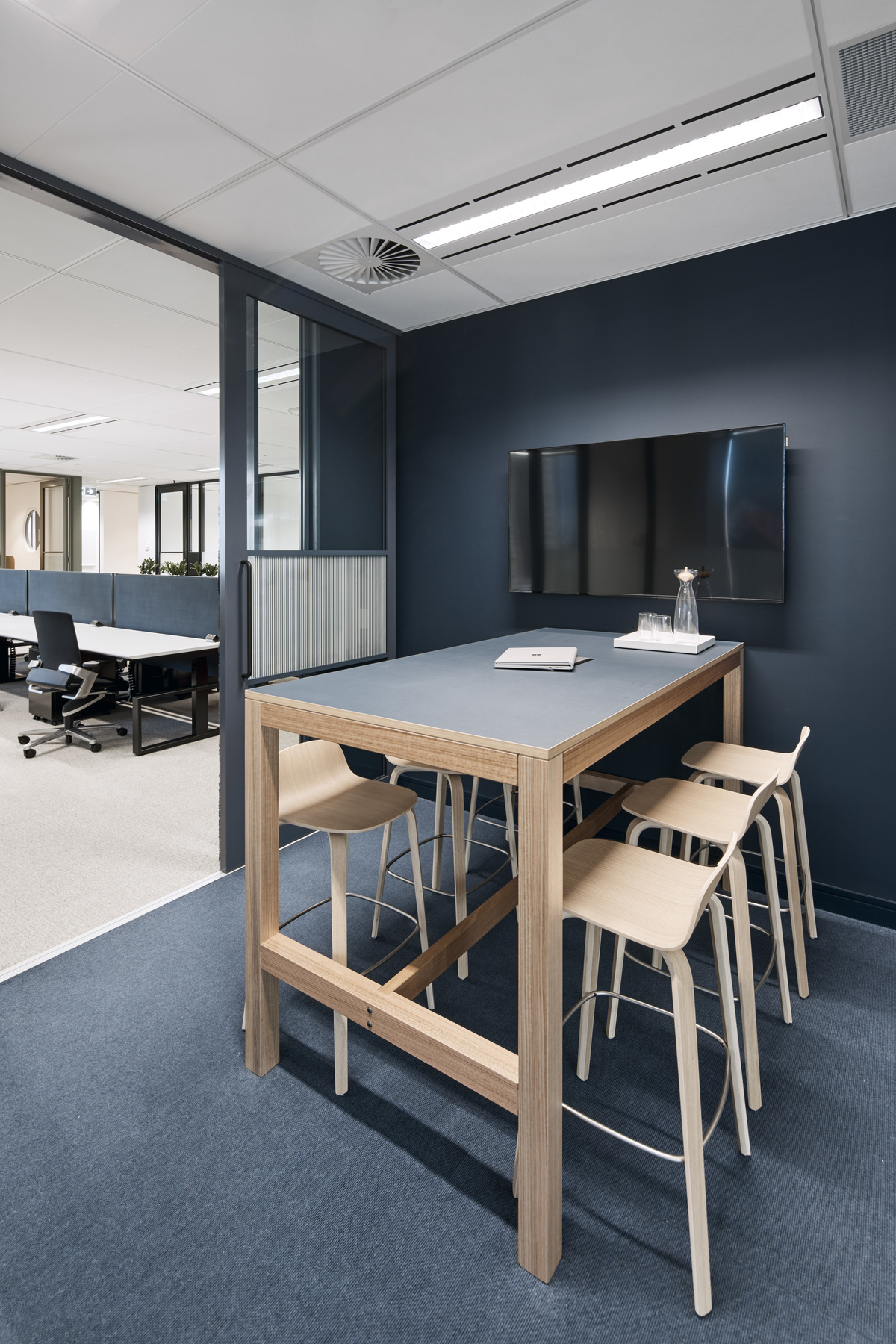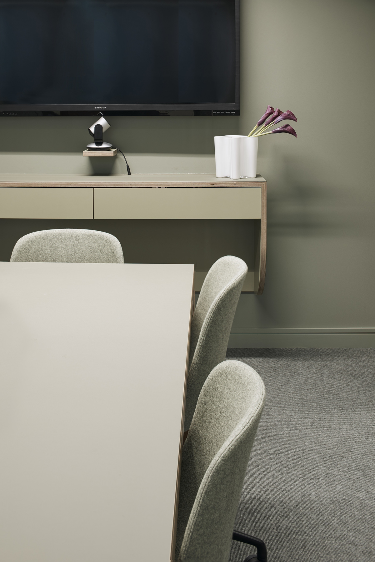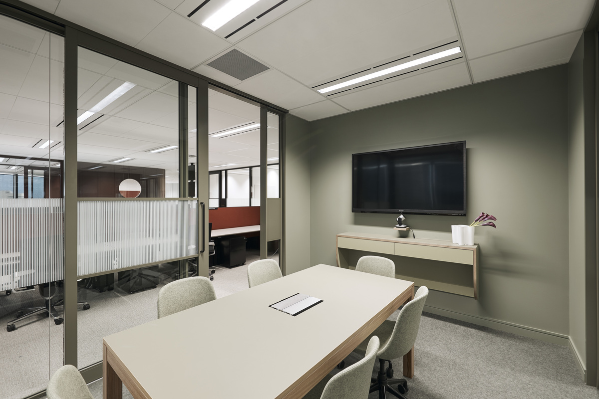 The use of colour is restrained to carpets and fabric wall paneling within meeting rooms and furniture upholstery only.
