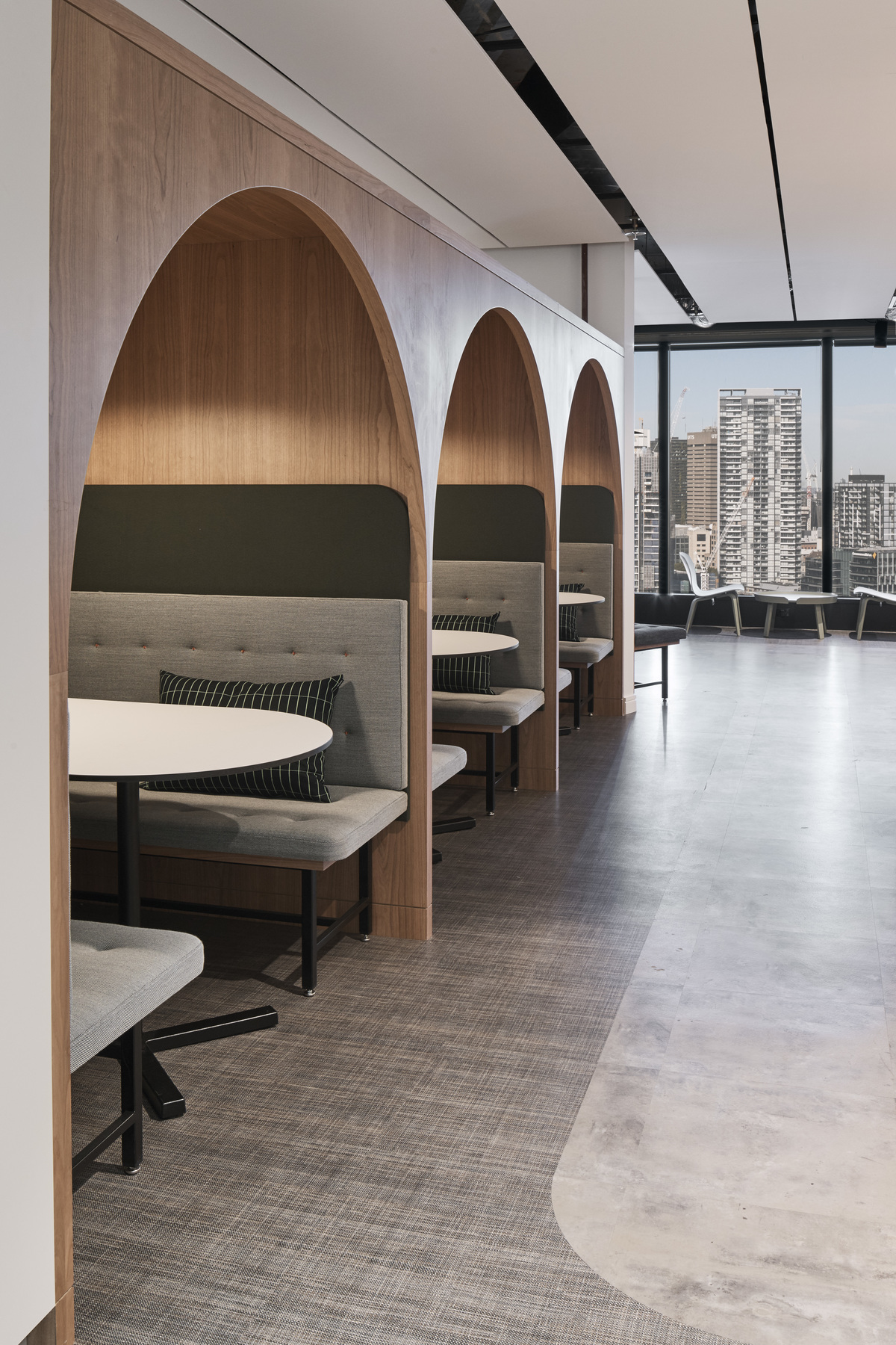 The main staff refresh hub was designed for multiple functions of varying scale, providing large open social gathering spaces through to private booths for up to four colleagues to collaborate or dine together.